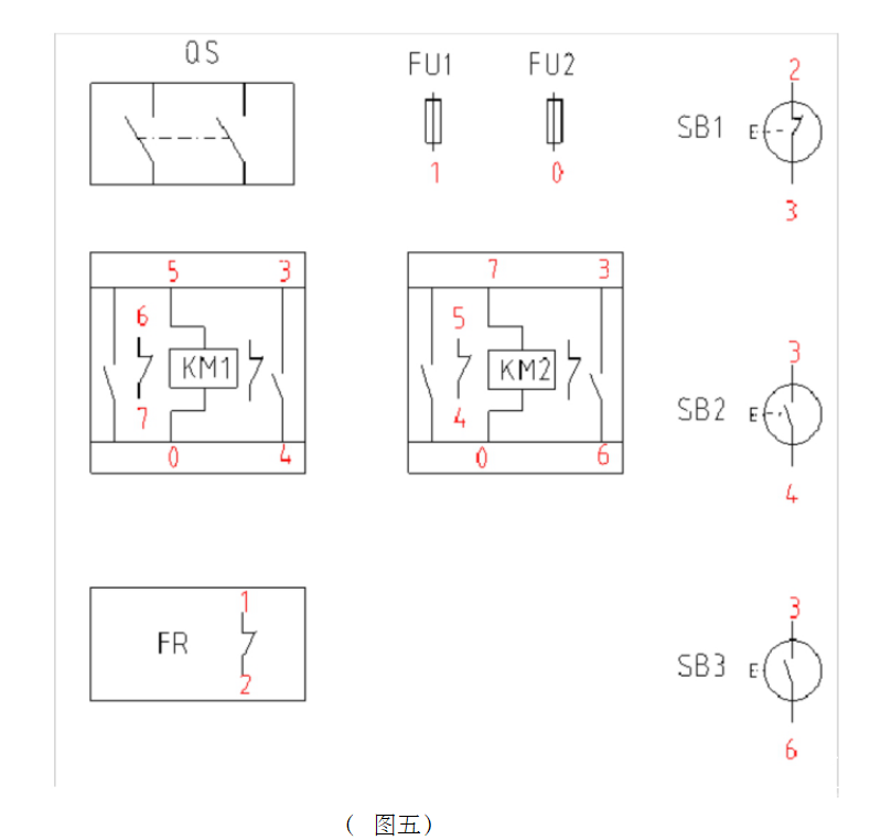 将原理图四的号码填入图三所对应的器件上 如 KM1 常开点 3,4 号, 两个线圈的一端都是 0 号。