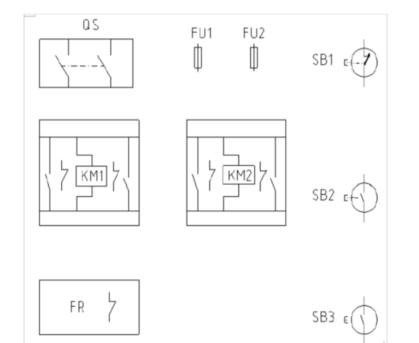 拿到原理图先看上面有哪些器件,设计一下这些器件位置如何安放,根据柜(盘)空间绘制平面布置图,如下面由原理图(图一)到实物布置图(图二)